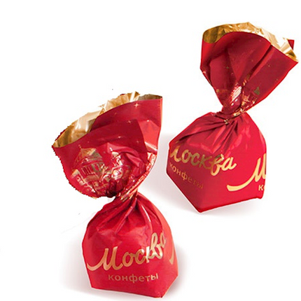 Sweets "Moscow" is an airy souffle with a soft caramel kernel, covered with milk chocolate with decorative patterns of red stripes.
