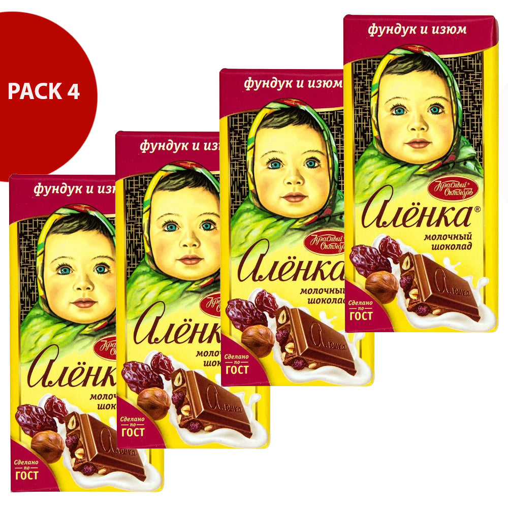 Упаковка из 4 банок молочного шоколада Alenka с фундуком и изюмом, 75 г x 4