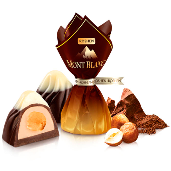 Roshen Mont Blanc с цельным лесовым орехом — это конфеты с комбинированным шоколадом (темным и белым) и орехом. Отличное лакомство для всей семьи.