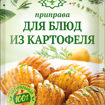 Приправа используется при приготовлении блюд из картофеля, обогащает вкус и аромат. соль йодированная, перец красный сладкий, лук репчатый, усилитель вкуса и аромата (глютамат натрия), сахар, зелень петрушки, чеснок, перец черный молотый, тмин, куркума, семена укропа, лавровый лист.